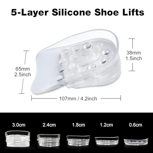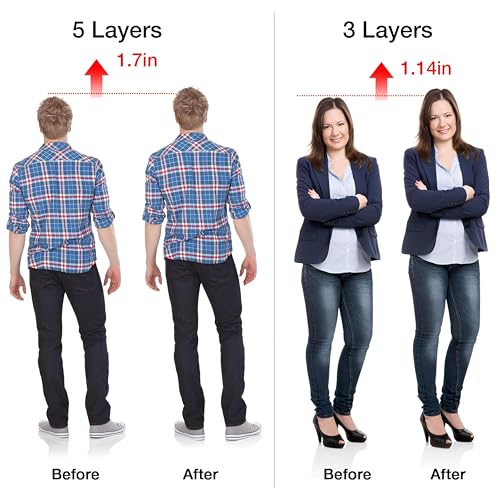 - 【ارتفاع قابل للتعديل】--يحتوي على 5 طبقات من نعال داخلية مرتفعة، كل طبقة بسمك 0.6 سم، ويوجد 5 ارتفاعات للاختيار من بينها 0.6 سم، 1.2 سم، 1.8 سم، 2.4 سم، 3 سم. يمكنك ضبط أفضل ارتفاع بحرية حسب أنواع الأحذية المختلفة.