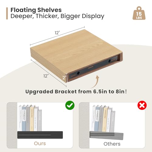Heimlove - Heimlove 12 Inch Deep Floating Shelves, 12 x 12 inches Long Wall Shelf, Large Extra Display Shelf & Storage Shelf, Rustic Wood Wall Shelves for Fireplace Mantel, Oak - 2Pack