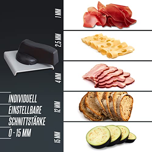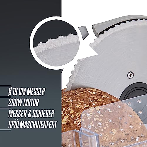 Heinrich´s - قطاعة معدنية متعددة الأغراض من هاينريتشز، قطاعة خبز كهربائية، قطاعة سجق، سكينة دائرية مصنوعة من الفولاذ المقاوم للصدأ (قطر 19 سم)، تعديل سمك قطع مستمر، قفل أمان مدمج، محرك 200 وات