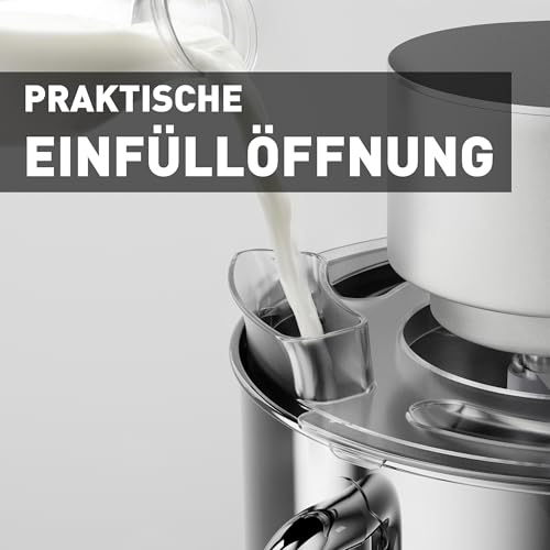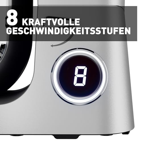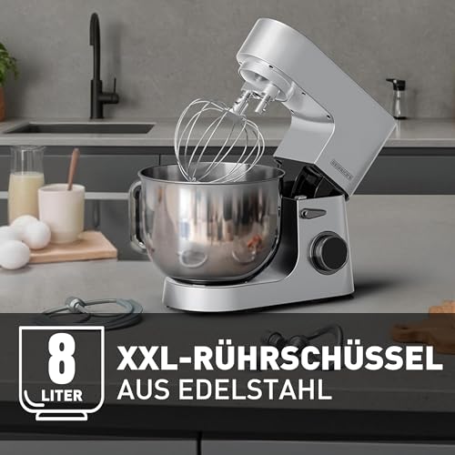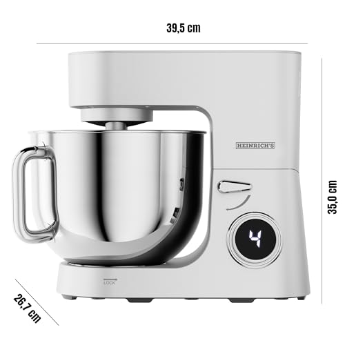 Heinrich´s - محضر طعام من هاينريتشز، الة عجن، الة عجين، جهاز مطبخ 2500 واط، خطاف عجين مزدوج، خطاف خلط، خفاقة، 8 سرعات قابلة للتعديل، وعاء ستانلس ستيل 8 لتر، ضوضاء منخفضة، فضي
