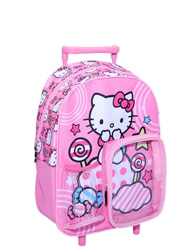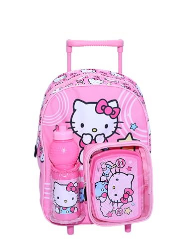 Hello Kitty - مجموعة شنط مدرسية بعجلات للأطفال مع زجاجة مياه ولانش بوكس، تصميم كرتوني وردي لطيف للبنات من هالو كيتي، 3 قطع