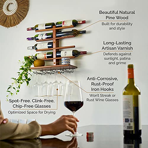 HELYA DESIGN - Wine Rack Wall Mounted for 8 Wine Bottles & Glasses - Stylish, Rust-Free Wine Glass Holder Drying Rack & Pine Wood Storage Shelf - Wine Decor for Kitchen, Dining Bar & Wine Gifts