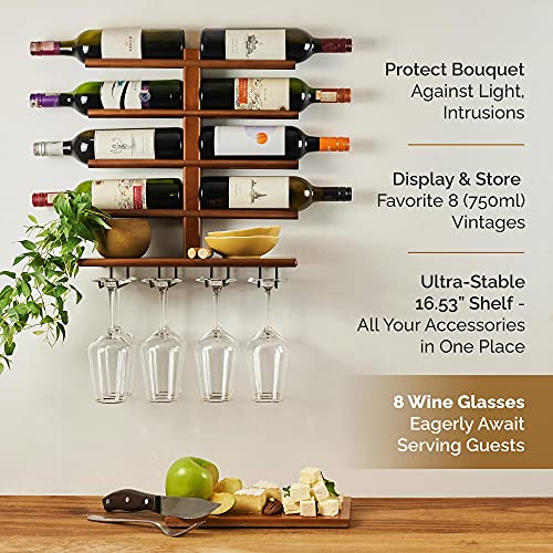 - Display Your Wine Collection IN GRANDE STYLE | Stylishly rustic wall-mounted wine holder displays 8 standard 750ml wine bottles PLUS 8 glasses, so your living room bar stays tidy, without sacrificing substance or style.