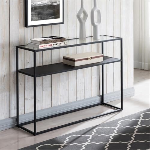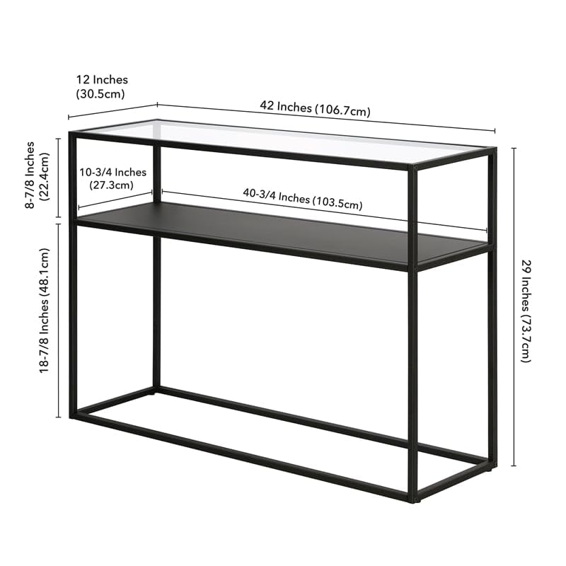 - Features a durable tempered glass top and solid metal shelf.
