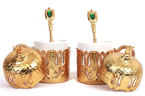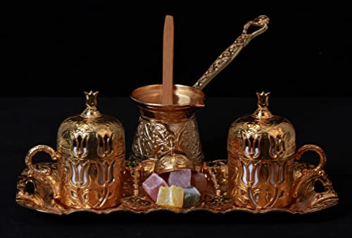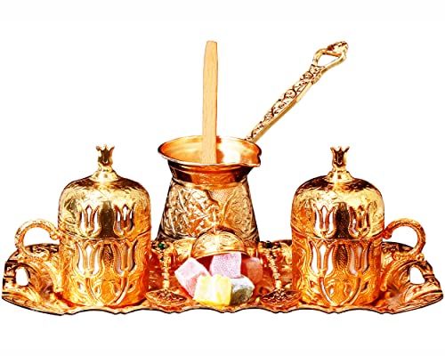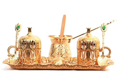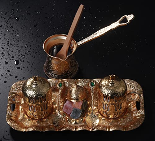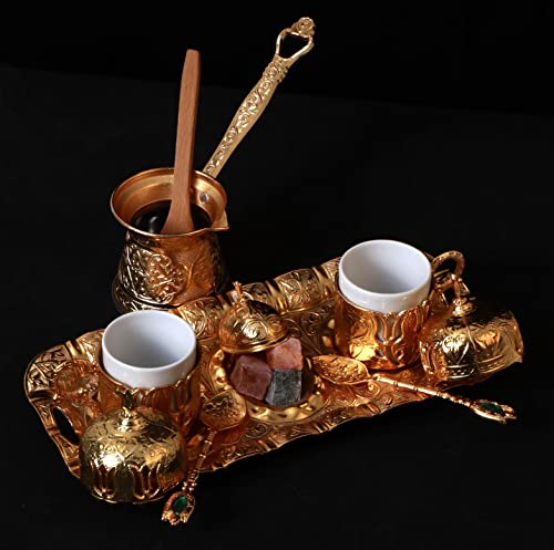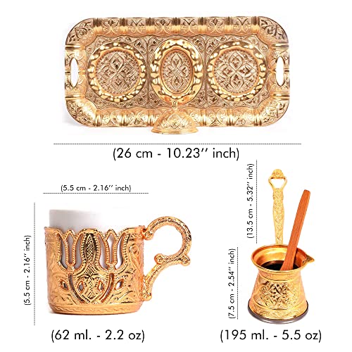 HeraCraft - مجموعة هدايا لطيفة لتقديم القهوة التركية باللون الذهبي العتيق - مجموعة من 8 قطع - مع صينية تقديم متعددة للقهوة التركية سعة 100 غرام، وعاء قهوة 6 اونصة و2 كوب وغطاء وصينية سكر وملاعق - افضل