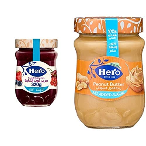 Hero - مربى بنكهة توت الغاية - خفيف - بوزن 320 جرام من هيرو مع مربى زبدة الفول السوداني بدون سكر مضاف بوزن 300 جرام من هيرو (عرض)