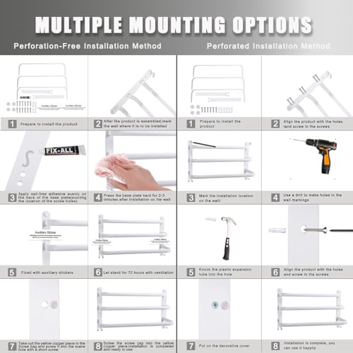 - Two installation methods: towel bar with a packaged nail-free adhesive and screw set, whether you want to install it with drilling to increase its load capacity, or without drilling to increase its convenience and can protect the wall. Installation options can be freely selected depending on the installation environment and preferences