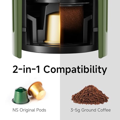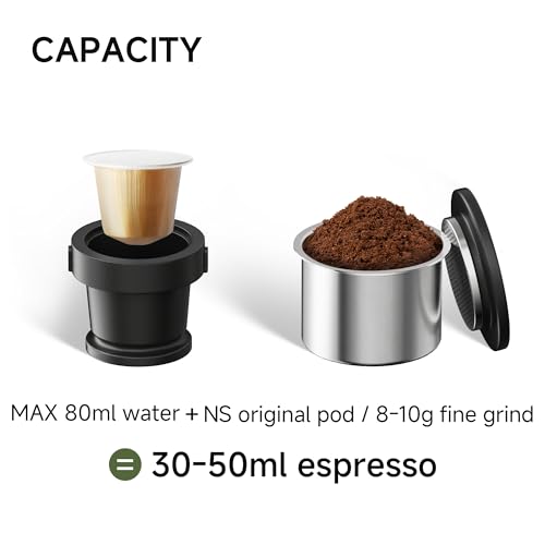 - [Dual Brewing System] Nes Original Pods & Ground Coffee Compatibility. Includes specialized Nes Original Pod adapter and grounds filter basket. Use pre-packed pods for effortless travel adventures, or experiment with specialty grounds for custom brews at home – enjoy lattes, americanos, and more.