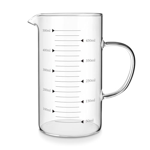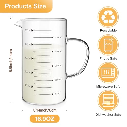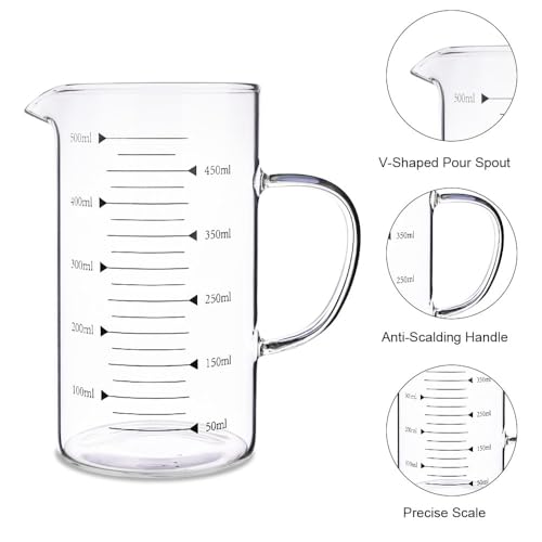 - Clear & Visuable Scale: The highest scale measurement is 500ml. The scale of this measuring jug is not easy to wear and is not easy to be wiped off. The transparent glass measuring jug can clearly see the contents and prepare for the amount needed