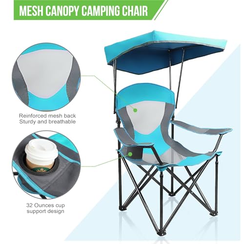 HIGH POINT SPORTS - كرسي تخييم قابل للطي مع مظلة شمس يتحمل وزنًا يصل إلى 160 كجم، كرسي صيد أسماك مزوّد بمظلة وحامل مشروبات، كرسي مع سقف للاستخدام في الخارج والشاطئ والفناء من هاي بوينت سبورتس