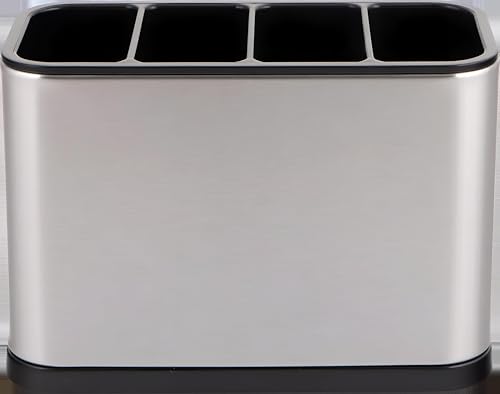 - This stainless steel utensil holder features four distinct compartments to neatly organize spoons, forks, knives, spatulas, whisks, and other kitchen tools, ensuring quick access and a clutter-free countertop.