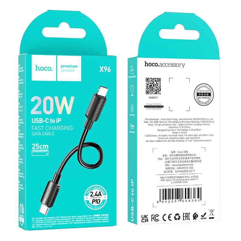 HOCO - Hoco X96 27W Type-C to Type-C Hyper PD Charging and Data Transmission Cable for Apple, Samsung, Huawei, Xiaomi, Oppo, 0.25 Meter Length, Black