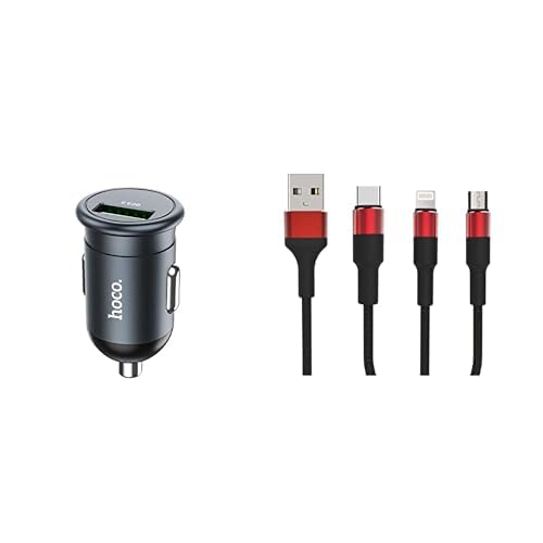 HOCO - HOCO ( Z43 - Mighty Single Port Fast Car Charger (18W - 3A), Charger Metal Grey, USB+Keendex KX 2463 3in1 Fast Charging and Data Transfer Cable for Type-C, Micro and iPhone, 1.2 Meters, lightning)