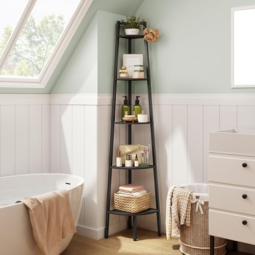 Hoctieon - Hoctieon Corner Shelf, 5-Tier Corner Bookshelf, Rustic Corner Ladder Shelf, Industrial Display Shelf for Living Room, Kitchen, Home Office, Balcony, Small Space, Metal Frame, Black