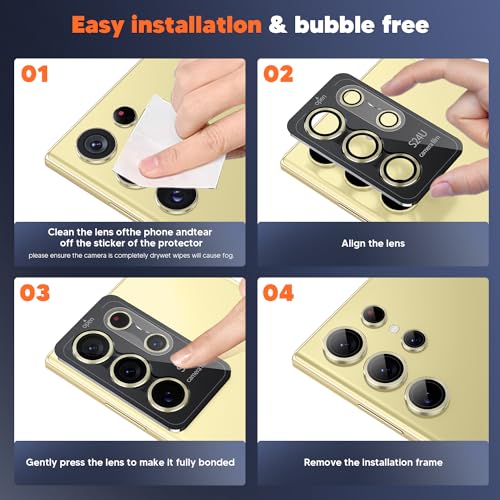 - Note! This Listing of Camera lens protector For Samsung Galaxy S24 Ultra ONLY!! Please do not use at the same time with the phone case with its own lens protection. Buy 1 sets you will get: S24 ultra camera lens protector + alcohol bag + dust sticker + removal tool + installation instructions
