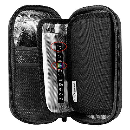 - حماية كبيرة - حافظة أقلام الأنسولين لمرضى السكري مصنوعة من مادة ايفا الصلبة مع نسيج نايلون مقاوم للماء، ويمكنها حماية محاقن الدواء والقوارير ومجموعة مرضى السكري بأمان دون أن تتعرض للكسر أثناء الرحلات. يمكن لشريط درجة الحرارة مراقبة درجة حرارة شنطة تخزين الأنسولين.