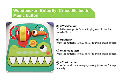 - Woodpecker; butterfly; crocodile teeth; music button.
