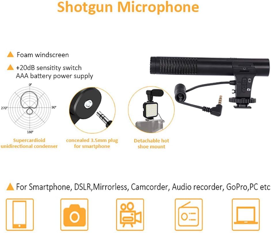 - 【ميكروفون بندقية】ميكروفون مكثف بندقية مصمم يتضمن مصدات رياح إسفنجية وحامل كولد شو لالتقاط صوت واضح ودقيق مع تقليل ضوضاء الخلفية؛ قابس قياسي 3.5 ملم وموصل عالمي قياسي للهواتف، التوصيل والتشغيل، يعمل ببطارية ايه ايه.