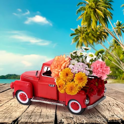 - Timeless vintage red truck design adds farmhouse charm and a nostalgic vibe to any room, serving as a stylish tabletop decor piece that fits in the kitchen, living room, shelves, or mantle as a focal accent.