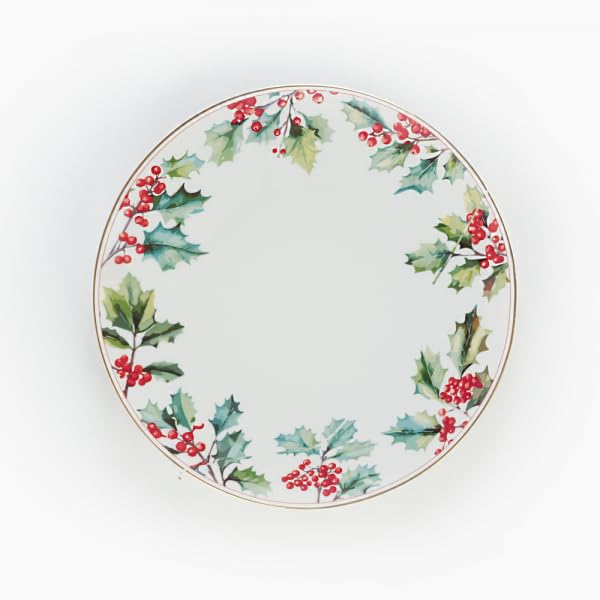 Generic - طبق عشاء هولي بيري من هوليداي هولي، بورسلين، أبيض مع تصميم زهور حمراء وخضراء، زخرفة ذهبية