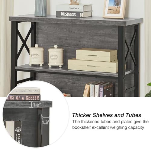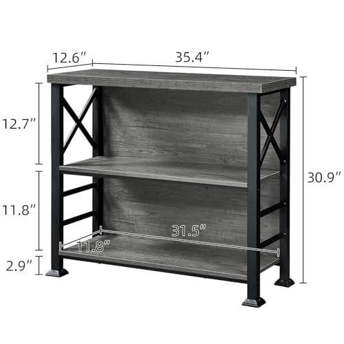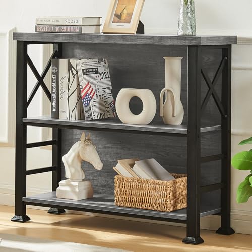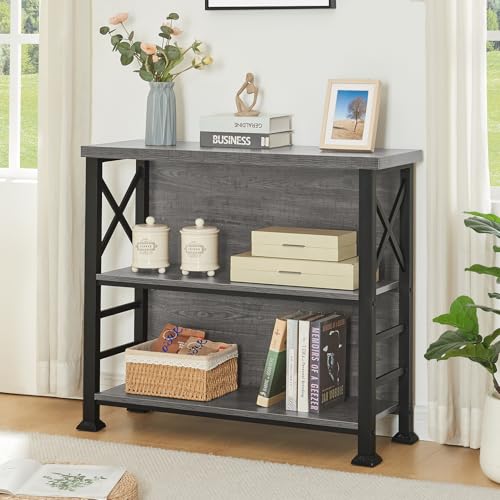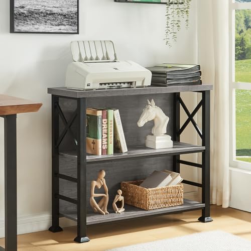HOMBAZAAR - هوم بازار رف كتب، رف كتب قصير من 3 طبقات مع اطار معدني ولوحة خلفية، حامل رف مكتب صغير، خزانة كتب برف مفتوح لغرفة المعيشة وغرفة النوم والمطبخ، رمادي