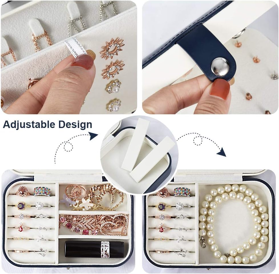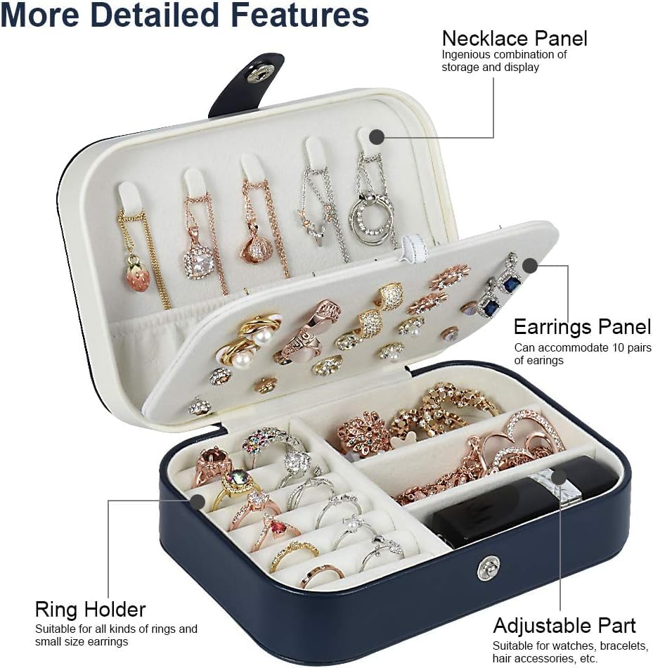 - ❤ MANY COMPARTMENTS FOR STORAGE: There is necklace panel with 5 snaps to hang necklaces, one earing panel for your different size earrings, ring holder is suitable for almost 10 pairs of rings and adjustable part for other size valuble things like wathces, bracelets and so on, make your jewelry well organized and easily access.