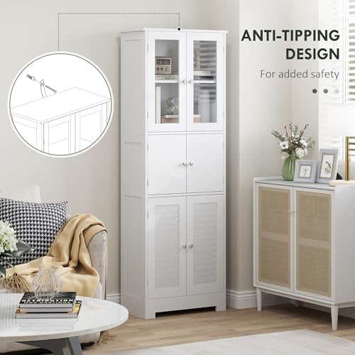 HOMCOM - HOMCOM Tall Bathroom Cabinet, Bathroom Storage Cabinet with Glass/Louvred Doors and Adjustable Shelf, Linen Cabinet for Kitchen, Study, Living Room, White