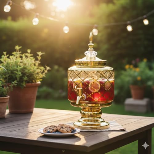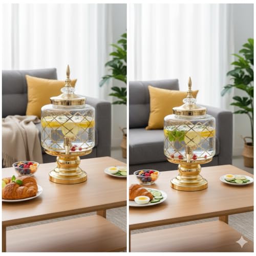 - Ornate Decorative Lid with Crystal Finial: The dispenser is topped with a matching golden lid featuring a sophisticated crystal-style handle. It keeps your beverages fresh and protected from dust while completing the majestic look.