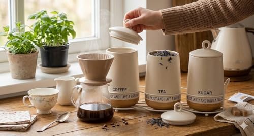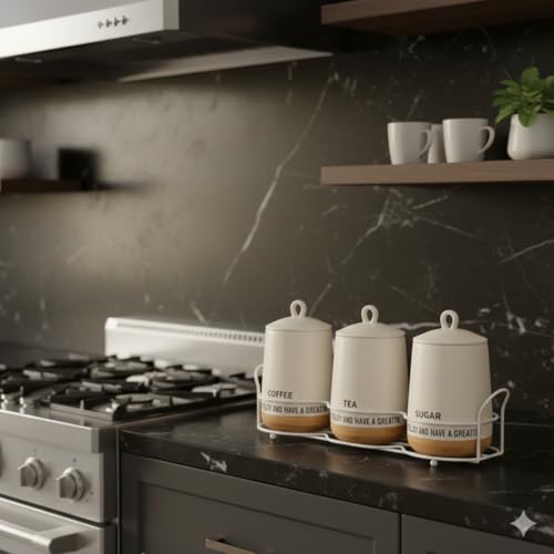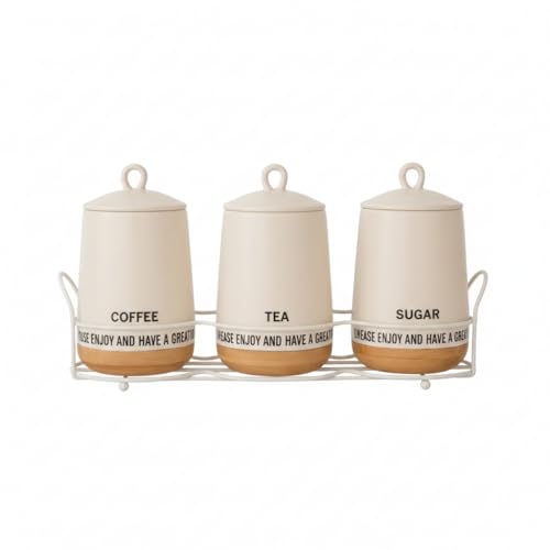 - Complete 3-Piece Organization Set: Includes three uniform ceramic canisters specifically labeled for "COFFEE," "TEA," and "SUGAR," providing a professional and clutter-free solution for your kitchen counter.