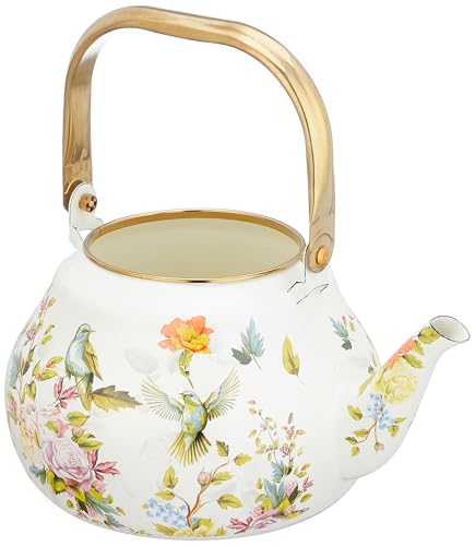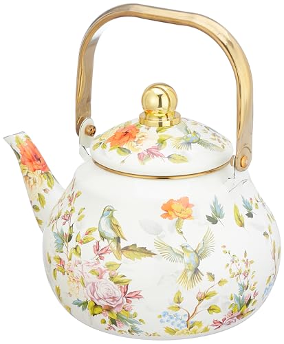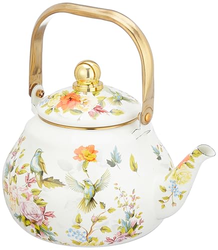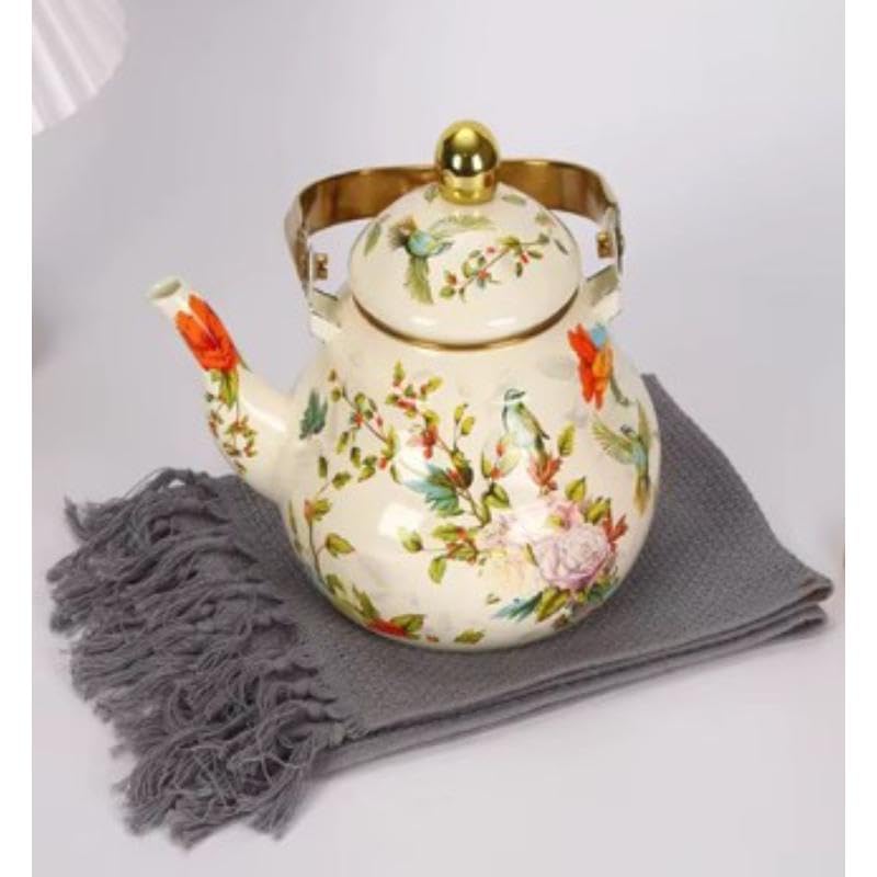- Luxurious Gold-Tone Accents: Equipped with a high-polished golden arched handle and a decorative lid knob, providing a sophisticated contrast against the detailed floral background.