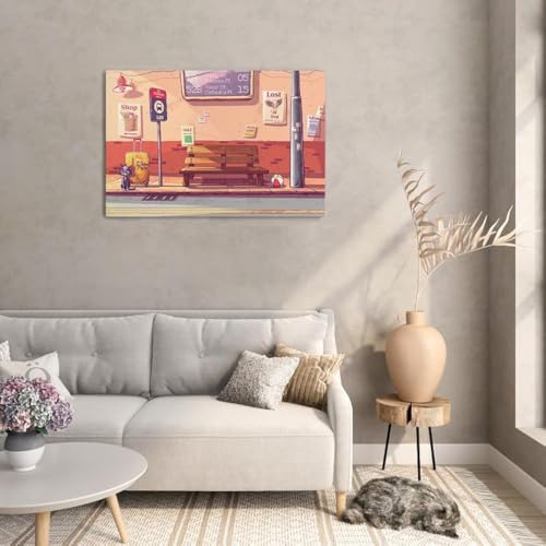 Home Gallery - لوحة فنية جدارية قماشية مطبوعة بتصميم موقف أتوبيس وقطة حزينة مقاس 90x60، من هوم جالاري، بيج
