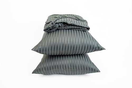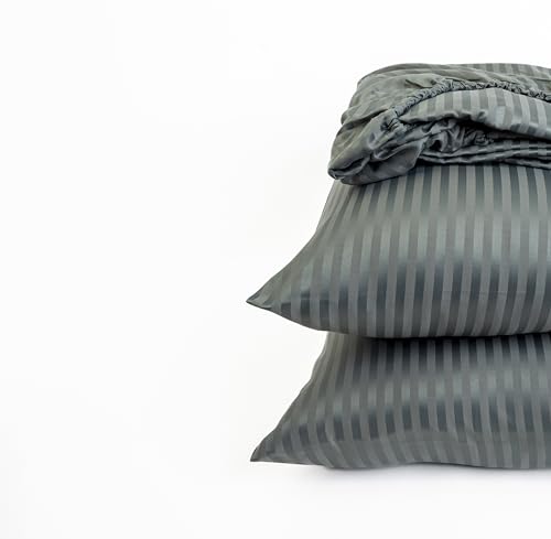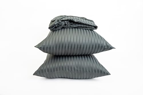 Home Of Linen - طقم ملاية سرير مخططة بأستك من هوم أوف لينين جودة عالية للفنادق وديكور المنزل 1 2 × متر + كيس مخدة 50 70 سم لمراتب حتى عمق 30 قطن مصقول لون رمادي غامق مُخطط