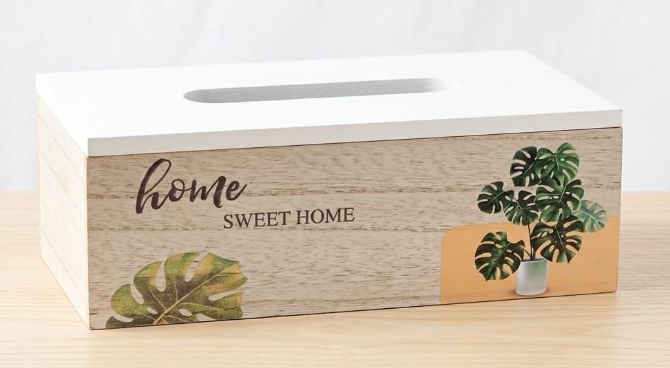 - تصميم عصري وأنيق: علبة مناديل بتصميم "Home Sweet Home" مع رسومات نباتات استوائية جميلة تضيف لمسة ديكورية دافئة لأي غرفة في منزلك