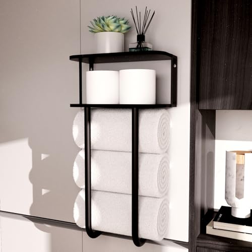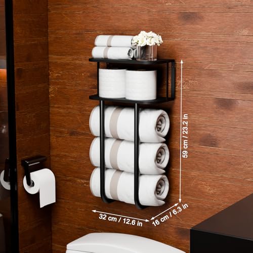 - Large Capacity and Space Saving: This bathroom shelf features two parts, towel rack and 2-tier wood shelf. The towel rack part is large enough to hold up to 3 extra-large size bath towels. The wood shelf could be as toilet paper storage, or storage for aromatherapy, greenery, and so on. Moreover, it mounts on the wall, eliminating the need for additional floor or cabinet space. The bathroom shelf is particularly beneficial for smaller bathrooms or making the most of available wall space.