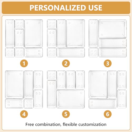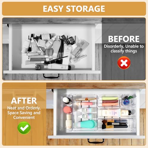 - Storage Options: These plastic drawer organizers fit different size drawers and areas, such as vanity, bathroom, kitchen, office drawers. They are perfect for storing makeup, toothpaste, jewelry, stationery, craft supplies, and more.