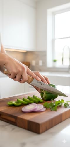 - Ergonomic wooden handle provides comfort and control for extended prep sessions.