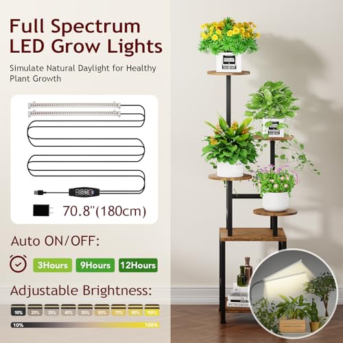 Homsorout - Plant Stand with Grow Lights, 5-Tier Indoor Plant Stand, Metal Plant Stand with Hanging Basket Hooks, Ideal for Living Room, Garden, Patio (Black Brown)
