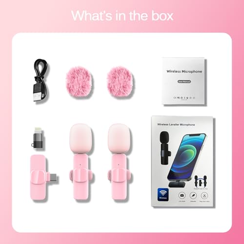 HONGJIEYUAN - Pink Wireless Lavalier Microphone for iPhone & Android - Mini Clip-On Mic with Noise Cancellation, 65ft Range, 8H Battery, USB-C/Lightning - for TikTok, YouTube, Podcast, Live Streaming