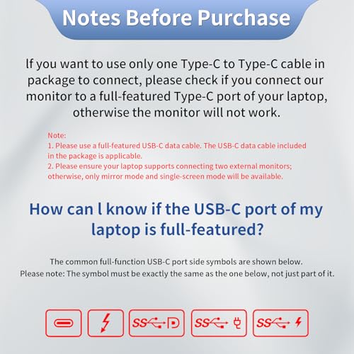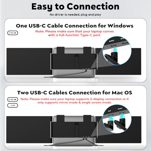 - 【Easy connection & Widely Used】: This Laptop Screen Extender has 3 USB-C ports, When connected to Windows, Only One USB-C cable needs to be used. When connected to macOS, two USB-C cables need to be connected. No driver or APP need. This screen extender is specifically designed to fit laptops ranging from 14" to 16.5". Note: Please make sure your MacBook supports 2-display connection or it only supports mirror mode & single screen mode.