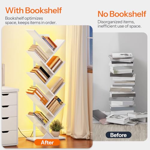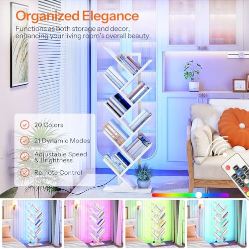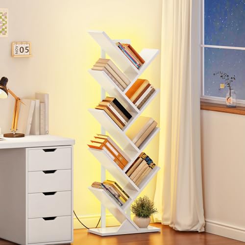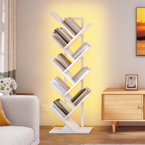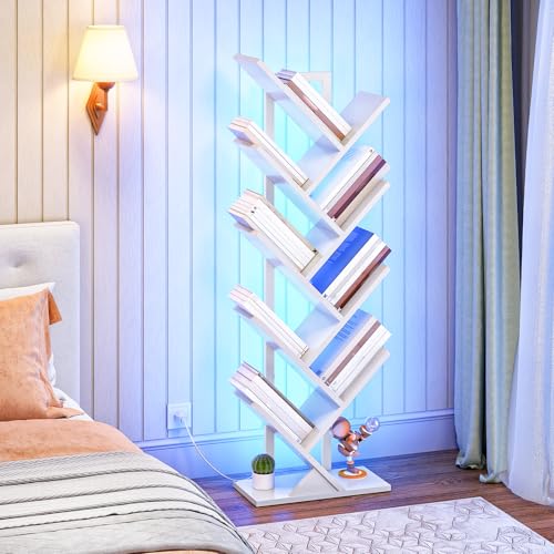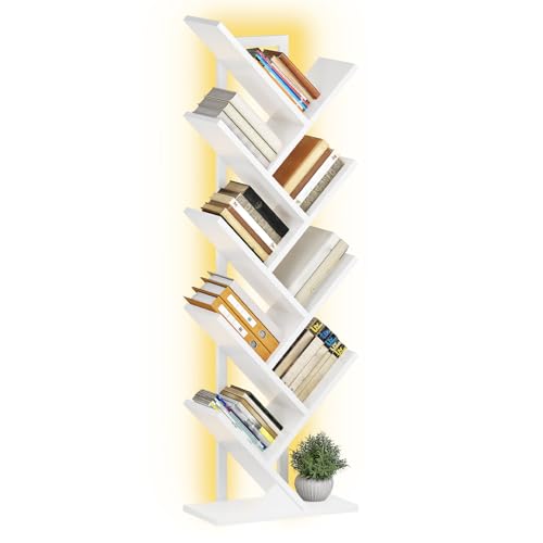 HOOBRO - HOOBRO 9-Tier Tree Bookshelf with LED Lights, Floor Standing Book Shelf, Modern Wooden Bookcase with Metal Frame, for Books, CD, Living Room, Bedroom, Office, White EWW08KDSJ01