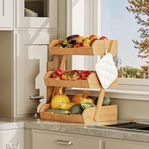 - Transform Your Space: Fruit basket can save you a lot of space on counter, This bamboo fruit basket features 3 trays of varying sizes to cater to your storing and sorting needs for fruits and vegetables, as well as incorporating 2 removable hooks for banana hanging