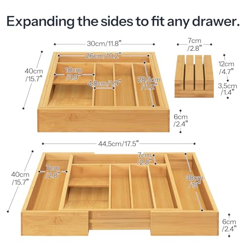 - Adaptable to Your Drawer Size: This silverware drawer organizer is adjustable to fit different drawer sizes, ranging from 11.8" to 17.5". It measures 17.5"L x 15.7"W x 2.4"H when fully expanded and 11.8"L x 15.7"W x 2.4"H when fully folded. Please measure your drawer dimensions before ordering