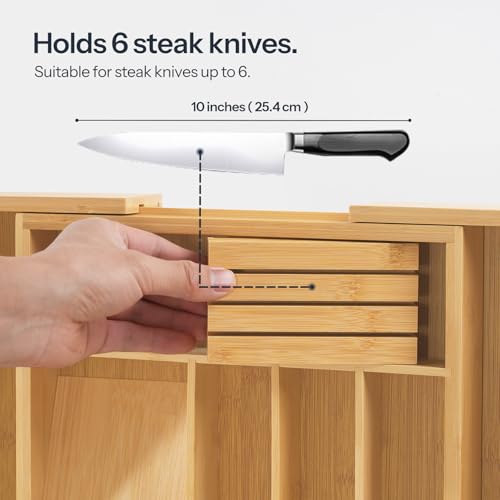 - Say Goodbye to Clutter: The kitchen drawer organizer boasts compartments of varying sizes along with two detachable knife holders, keeping knives, spatulas, spoons, and forks neatly hidden away. No more worrying about messy kitchen drawers!