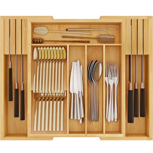 HOOBRO - HOOBRO Bamboo Kitchen Drawer Organizer, Expandable Silverware Drawer Organizer, Utensil Holder and Cutlery Tray with Removable Knife Holders for Flatware and Kitchen Utensil, Natural YL06TL01