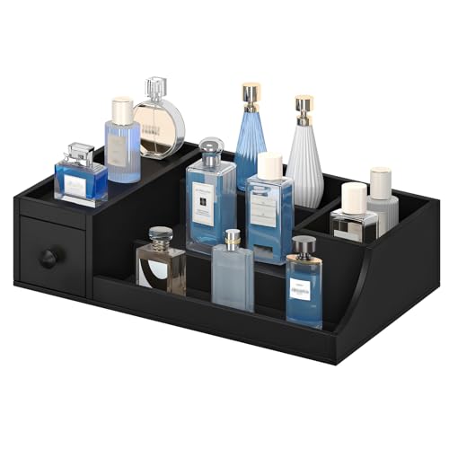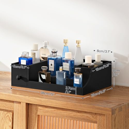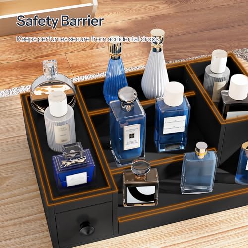 - Zoned Design: The perfume stand has 5 sections of varying depths and sizes, enabling you to categorize and store perfumes, skincare products, sunglasses, razors, and more. The drawer lined with velvet is for keeping important accessories scratch-free