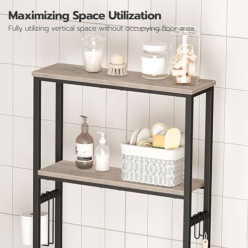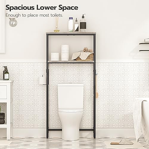 - Versatile Storage: With 2 open shelves, 1 toilet paper hook and 3 functional hooks, this over toilet bathroom organizer can hold bath towels, candles, scented products, plants, toilet paper or hand wipes so that everything is within reach