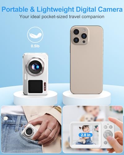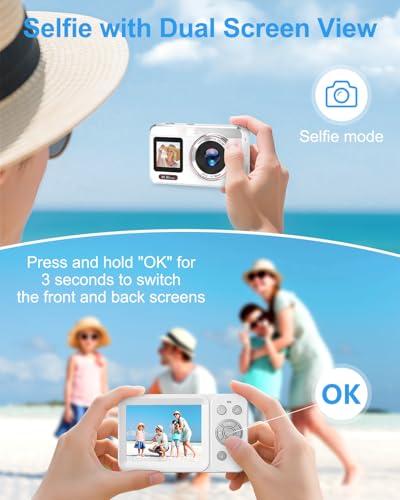 - 【Dual-Screen Camera with Autofocus】Flip between front and rear screens instantly for versatile shooting! This vlogging camera features responsive autofocus and a built-in flash, ensuring sharp, well-lit images in portraits, low-light scenes, or dynamic environments. This point and shoot digital camera great for selfies, group shots, and creative content creation.