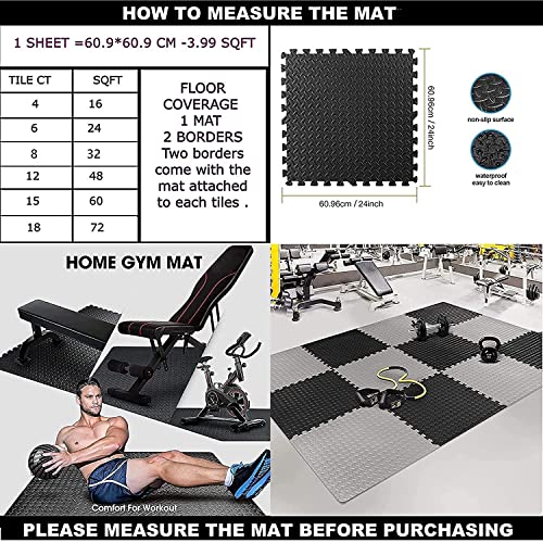 - 【Gym Floor Mats for Heavy Workout 】–foam rubber mats, color – black, grey, black with grey size-60.9*60.9 cm-3.99 sqft. each gym floor mat has 2 borders in it. Ex-4 puzzle mat =>16 sq feet. gym mats for floor Thickness -25mm =>1 inch foam mats for gym and yoga, kids.