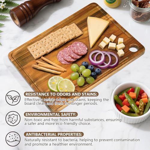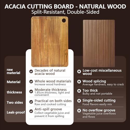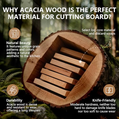 - 【مادة خشب الأكاسيا الفاخرة】 مصنوع من خشب الأكاسيا الراقي، هذا اللوح ليس متينًا وصديق للسكين فحسب، بل تضمن الحبوب الخشبية الغنية أن كل لوح فريد من نوعه، مما يضيف الأناقة إلى مطبخك.