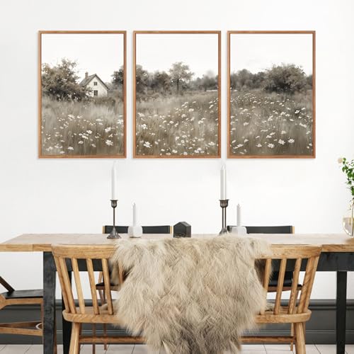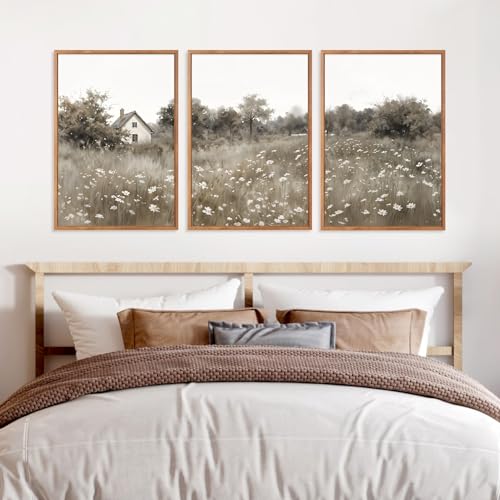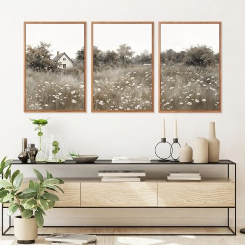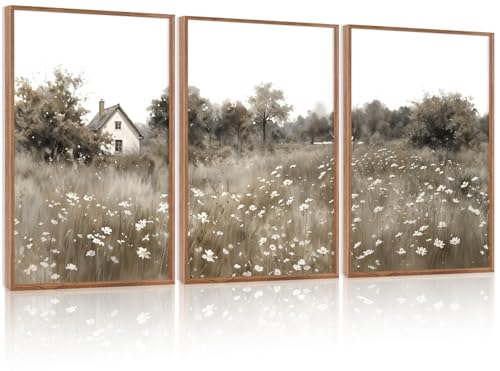 HOURIA - HOURIA 3Pcs Pastoral Countryside Landscape Canvas Wall Art (16"x24"), Rustic Wildflower Cottage Wall Decor, Vintage Mid Century Modern Natural Scenery Art Print for Office Living Room Farmhouse